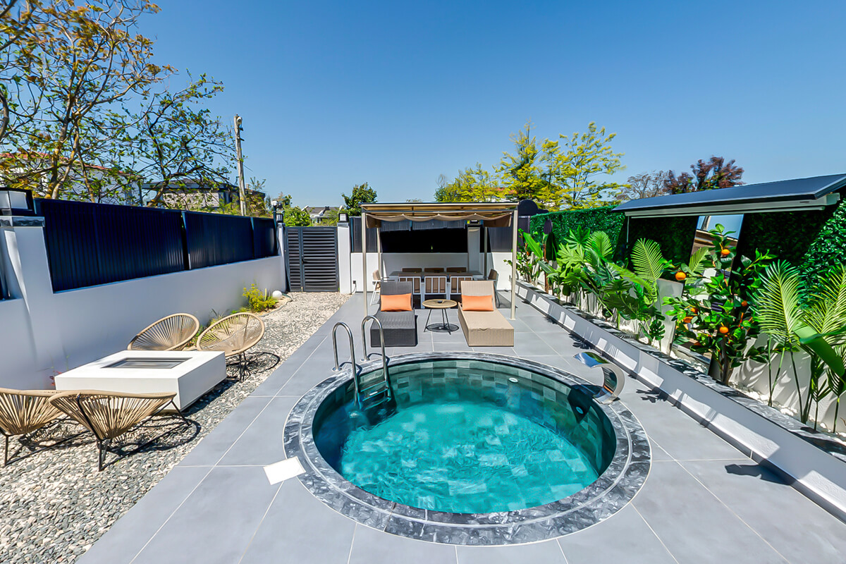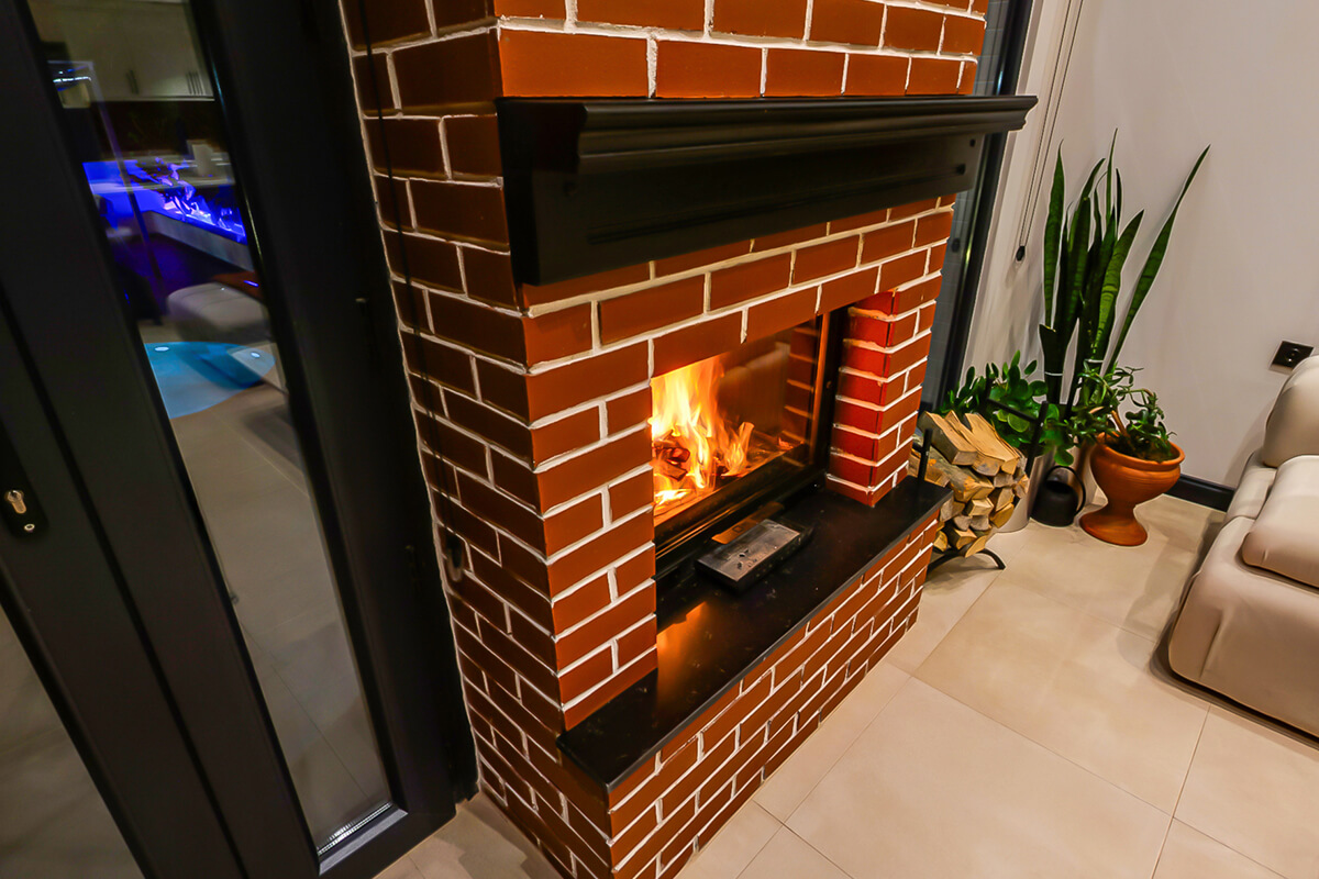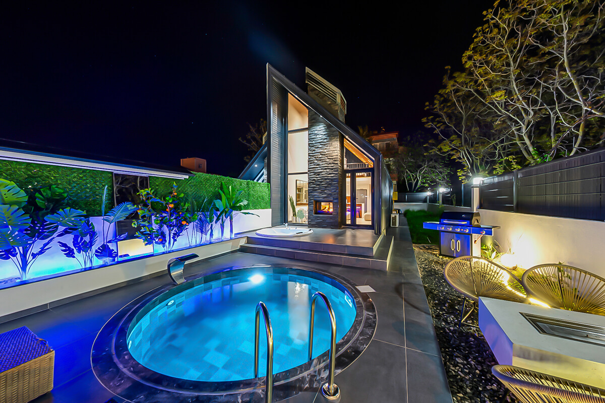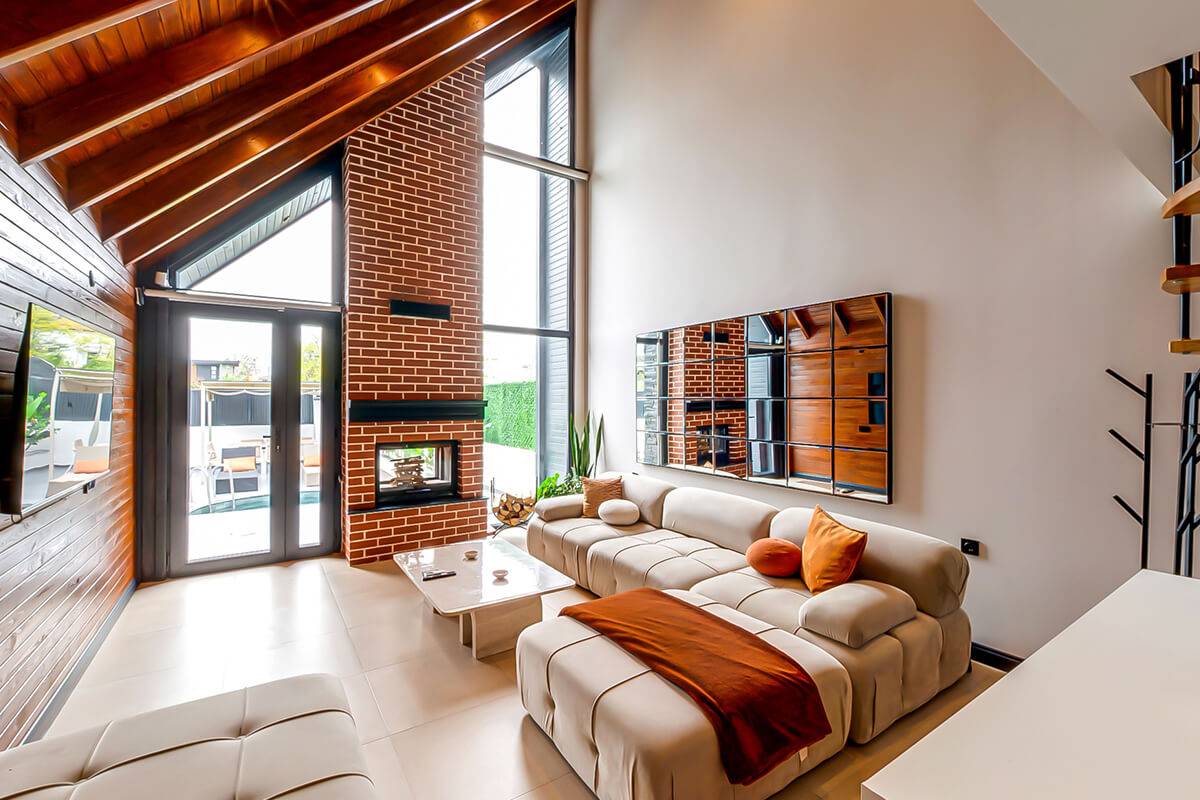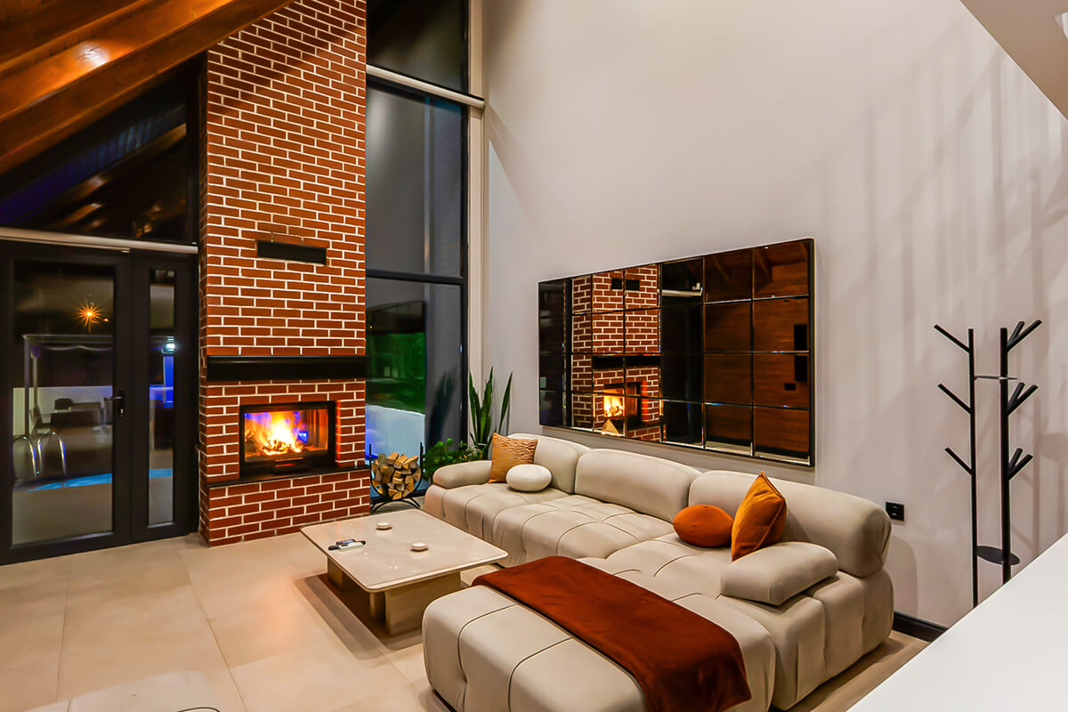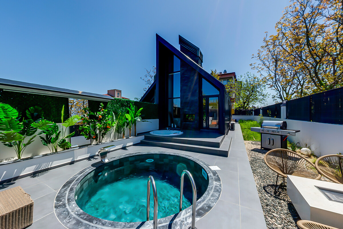 Salon, jakuzi alanı ve bahçeye erişimi olan ortak alanları ısıtan çift taraflı bir şömine bulunmaktadır. Bu özellik, geniş bir alanda sıcak ve keyifli bir atmosfer yaratmaktadır.