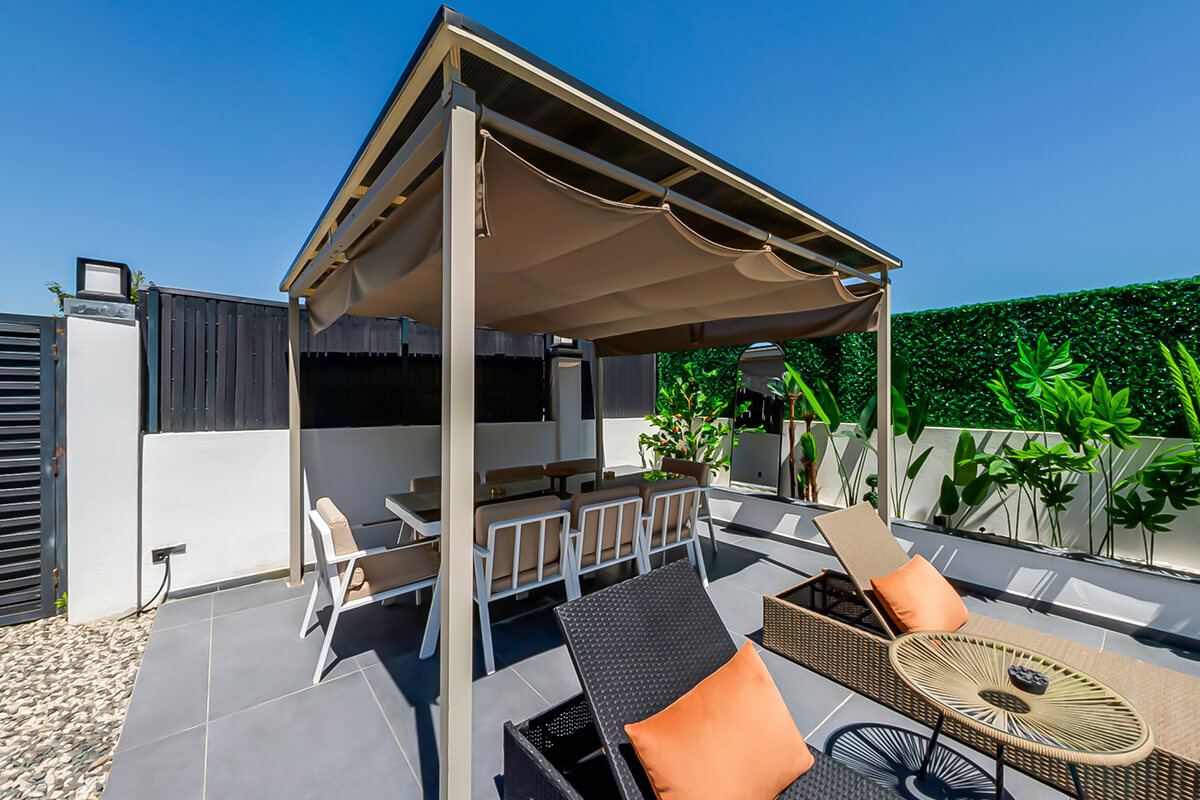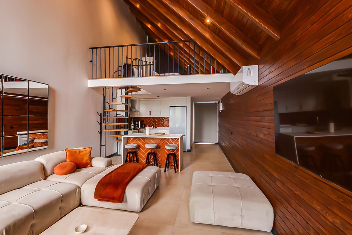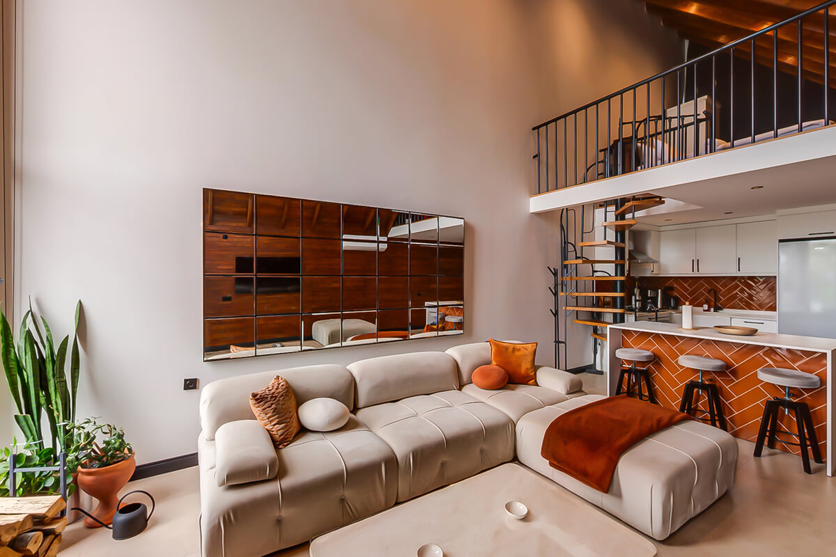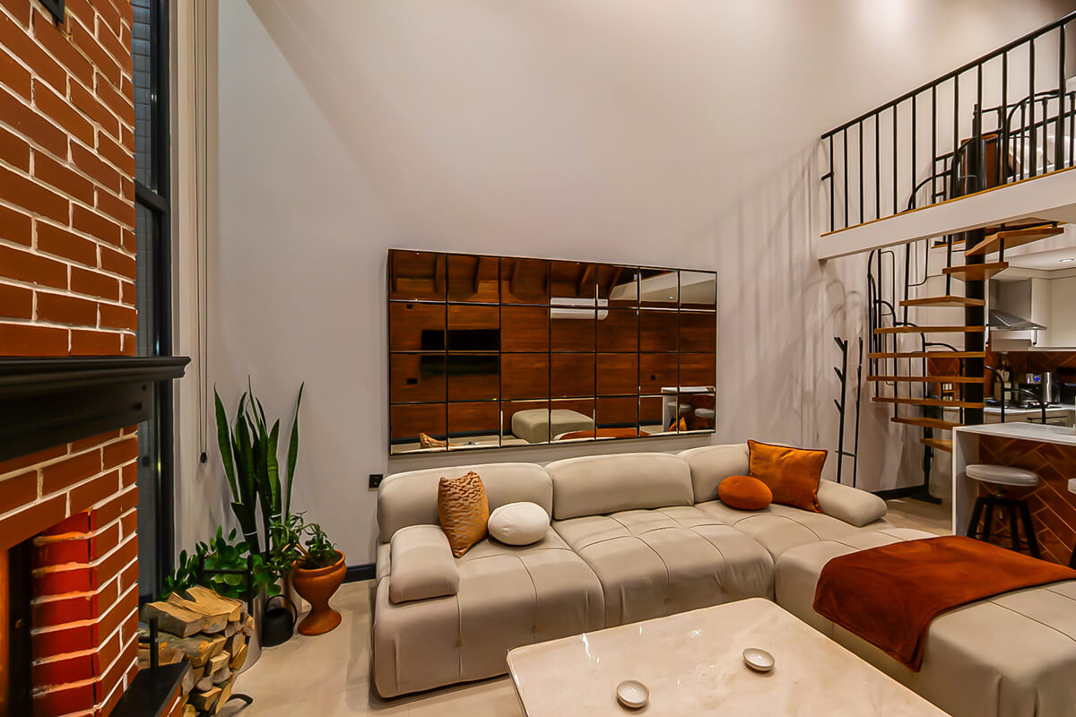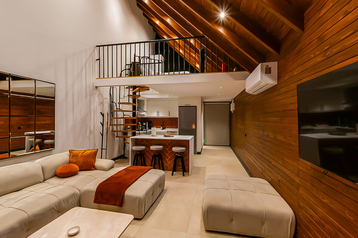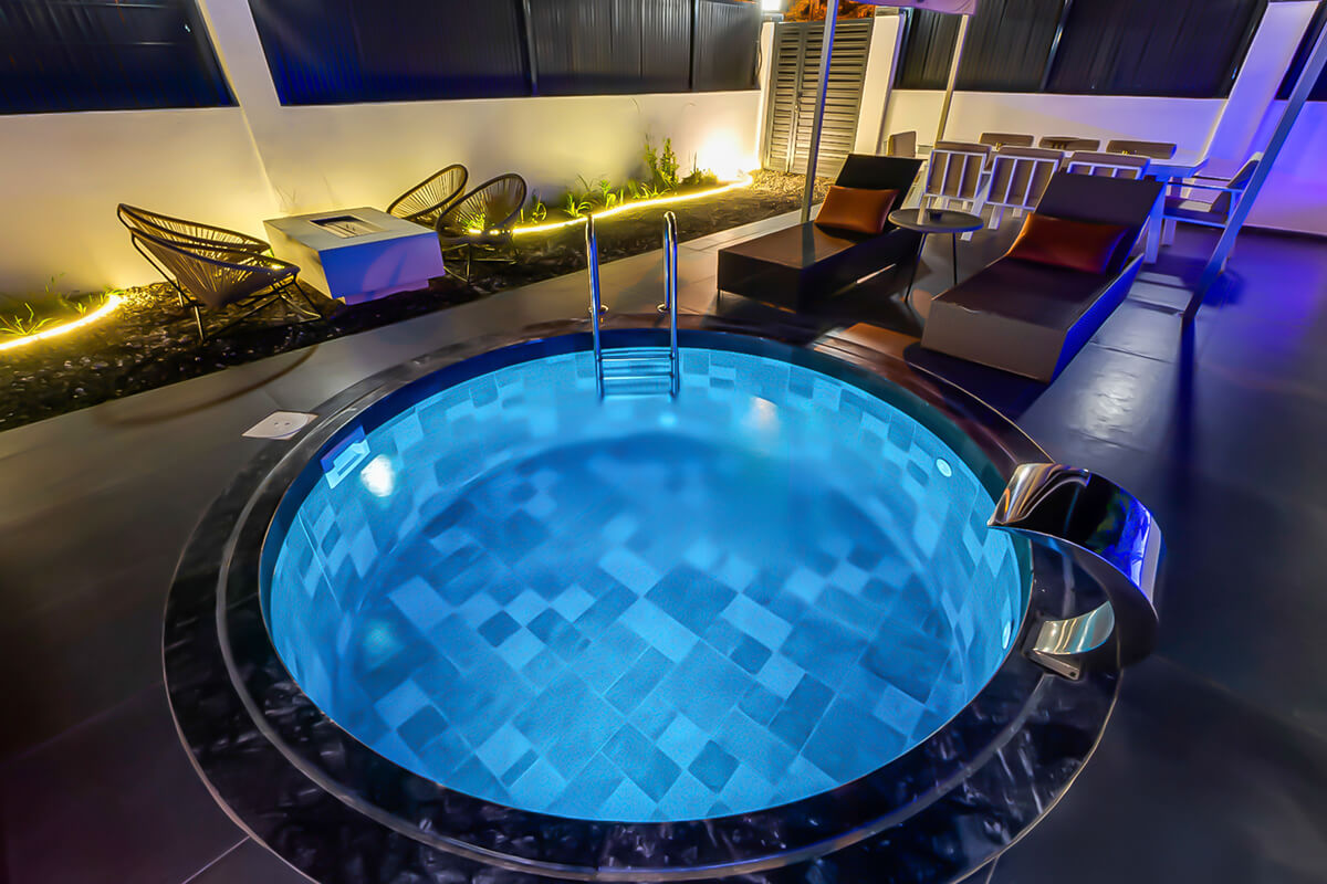 Salon, jakuzi alanı ve bahçeye erişimi olan ortak alanları ısıtan çift taraflı bir şömine bulunmaktadır. Bu özellik, geniş bir alanda sıcak ve keyifli bir atmosfer yaratmaktadır.