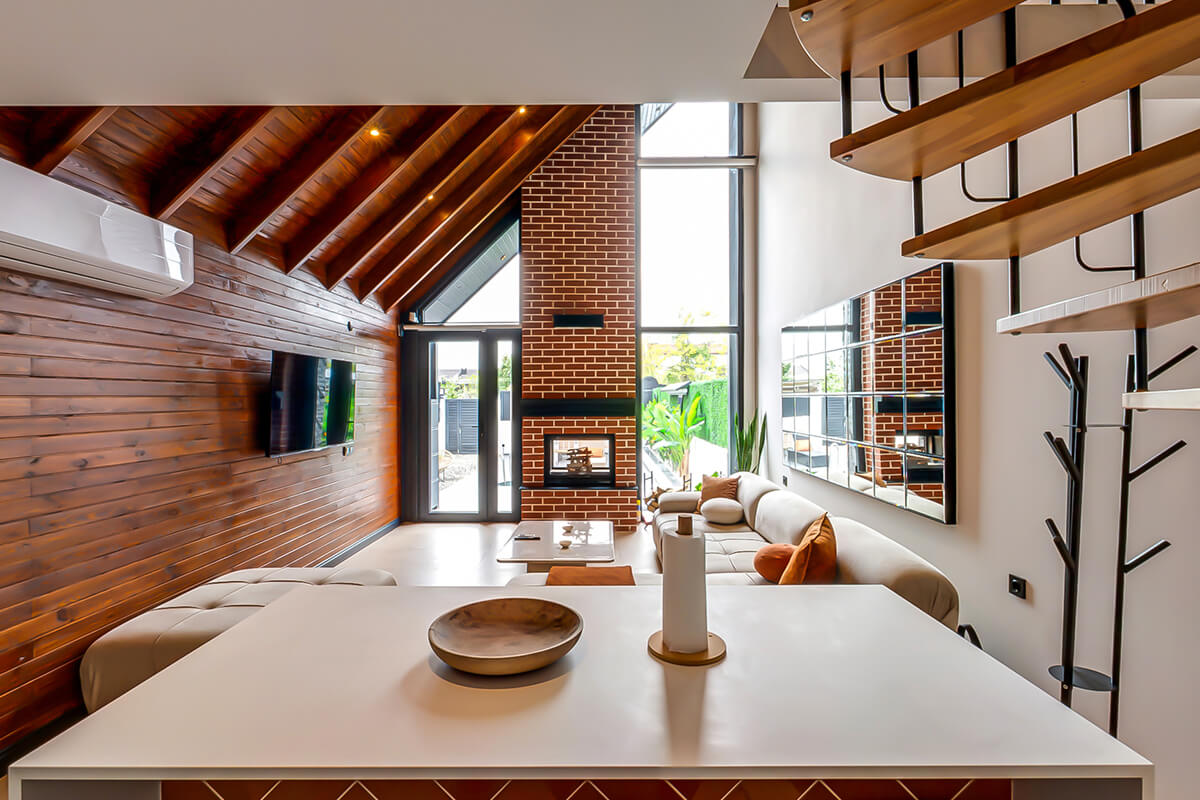 Üşüyenler için plan hazır: Çift taraflı şömine bir tıkla hem salonu hem verandayı ısıtır, çıtırdayan odun sesleri fon müziği olur. Karnın mı acıktı? Tam donanımlı mutfakta espresso makinesinden fırına kadar her şey elinin altında; sevdiklerinle sofrayı kur, keyfi uzat.